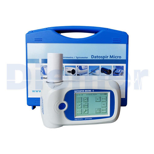 Espirómetro portátil DATOSPIR MICRO con transductor de turbina. Permite conocer la cantidad de aire que puede retener una persona en sus pulmones y a que velocidad. Es ligero lo que facilita su portabilidad y además permite un almacenamiento de más de 1000 registros con la posibilidad de transferirlos al PC para una mejor gestión.