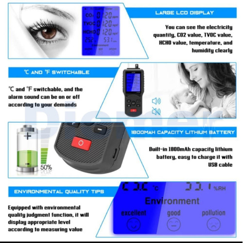 Su capacidad de bajo consumo nos proporcionar un largo tiempo de servicio. Gracias al gran tamaño de su pantalla, se puede ver claramente la batería restante, el valor de CO2, el valor de TVOC, el valor de HCHO, la temperatura y la humedad.